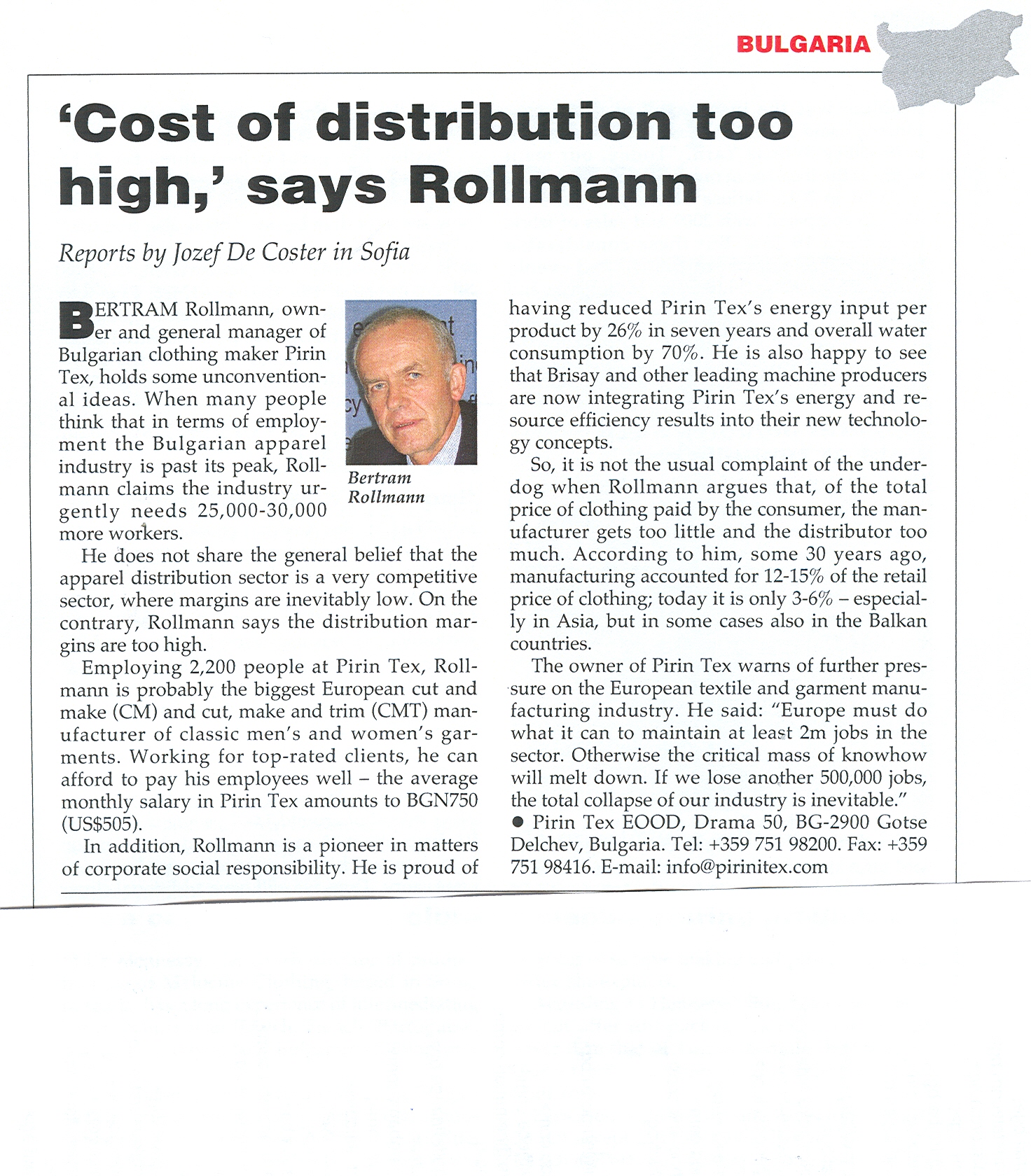 Members in the Press"Cost of distribution too high", says RollmannBertram Rollmann, owner and general manager of Bulgarian clothing maker Pirin Tex, holds some inconventional ideas. When many people think that in terms of employment the Bulgarian apparel industry is past its peak, Rollmann claims the industry urgently needs 25,000 - 30,000 more workers. He does not share the general belief that the apparel distribution sector is very competetive, but the margins are inevitably low. On the contrary, Rollmann says the distribution margins are too high. ......... The whole interview you can download here : Bertram Rollmann - interview De Coster.jpg |
